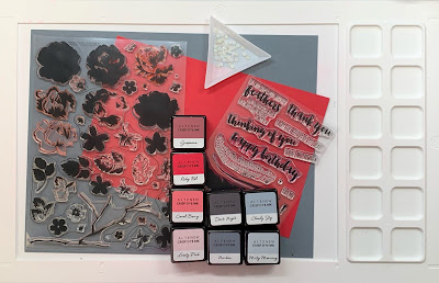 I chose to use the embossed resist technique on this card, using some of the smaller blossoms for Vintage Flowers for my pattern
